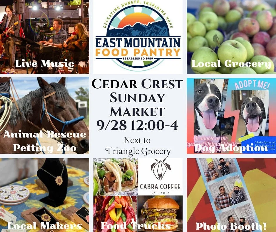 Back to All Events Cedar Crest Makers' Market Sunday, September 28, 2025 12:00 PM 4:00 PM Triangle Grocery Farmers Market Lot 12165 New Mexico 14 Cedar Crest, NM, 87008 United States (map) Google Calendar ICS