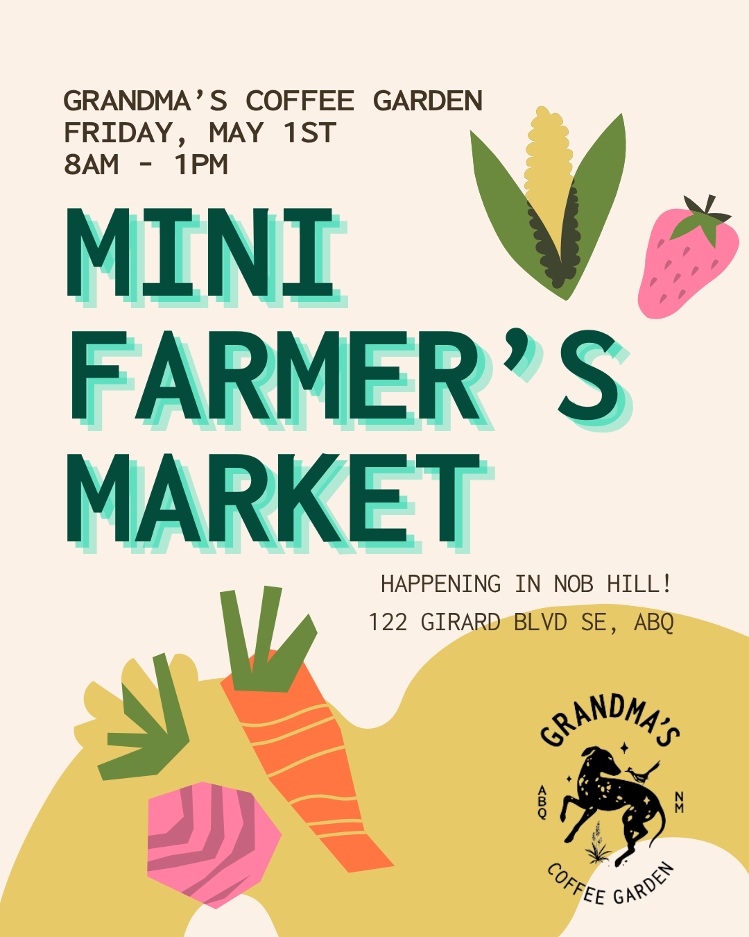 Busy on the weekends, but love a good farmer’s market? Join us for a mini market at Grandma’s Coffee Garden on Friday, May 1st! Local, small-scale farmers and value-added (minimally processed products made from locally-grown ingredients) vendors will be on hand to help you get your fill of fresh, local goods while you fill-up your coffee mug.